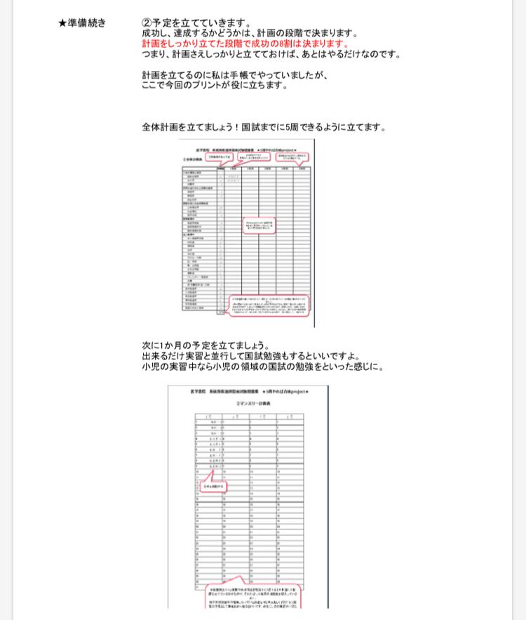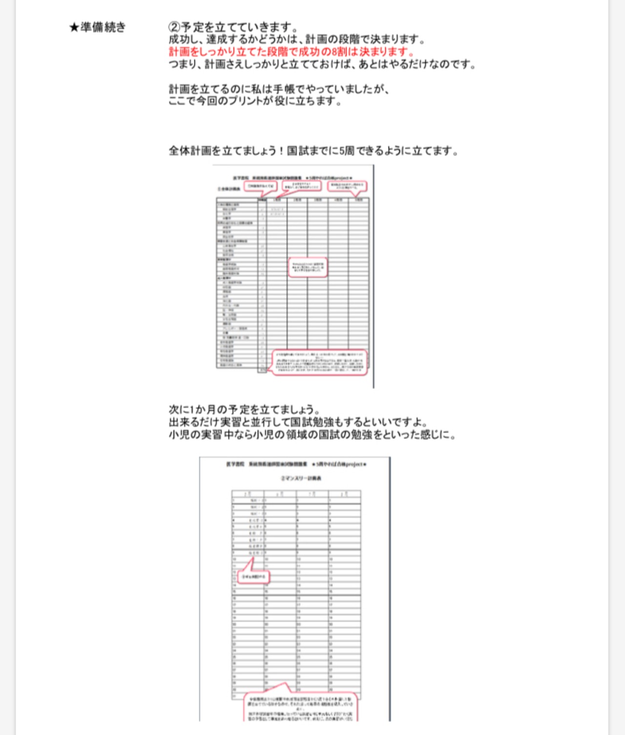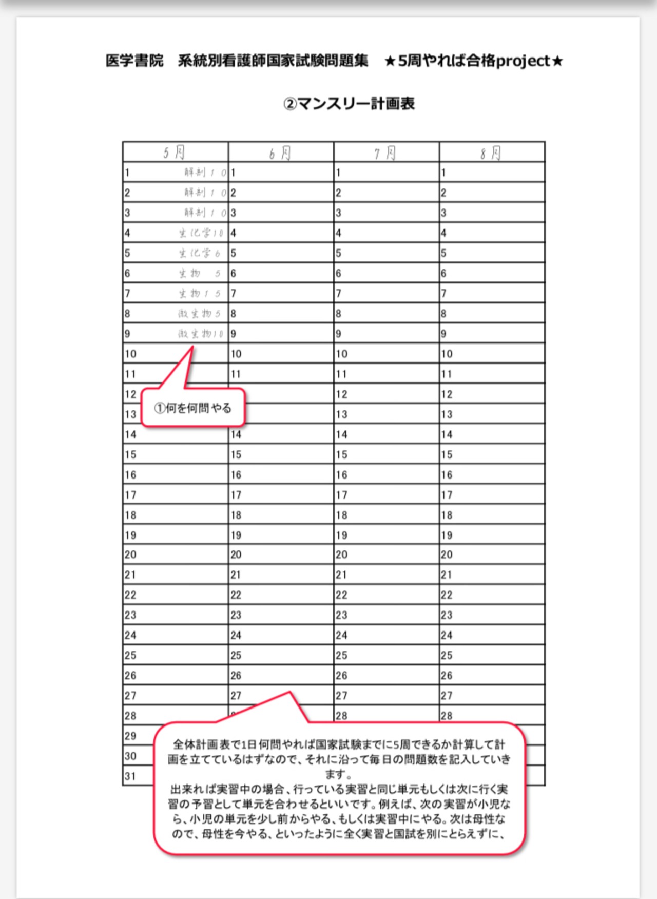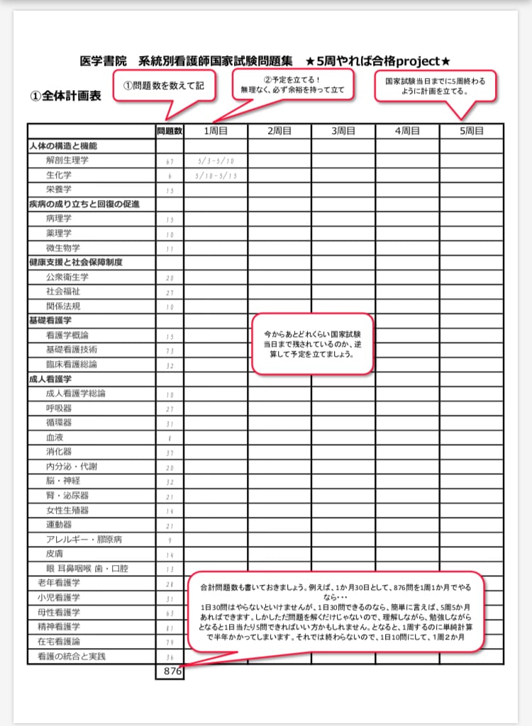 看護師国家試験に合格するための計画を立てるための用紙です。